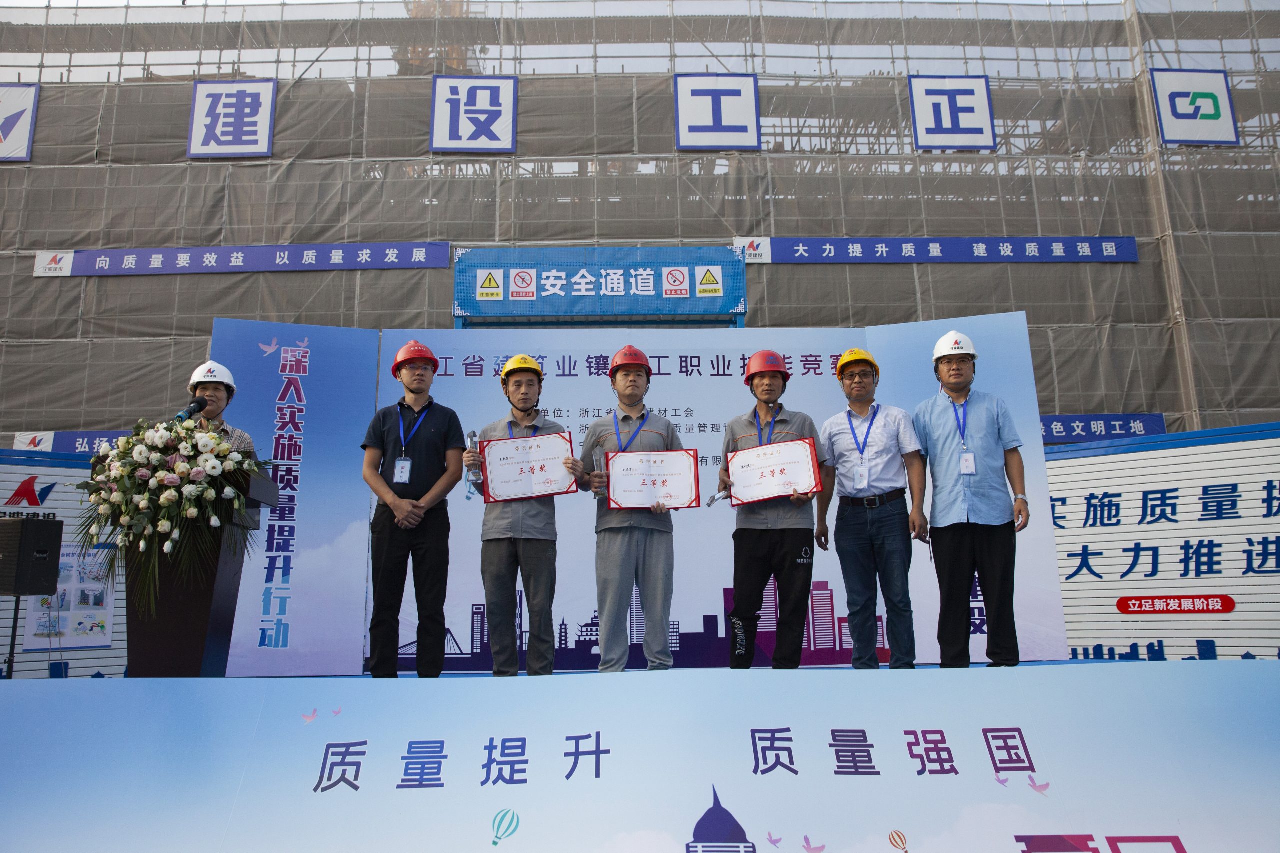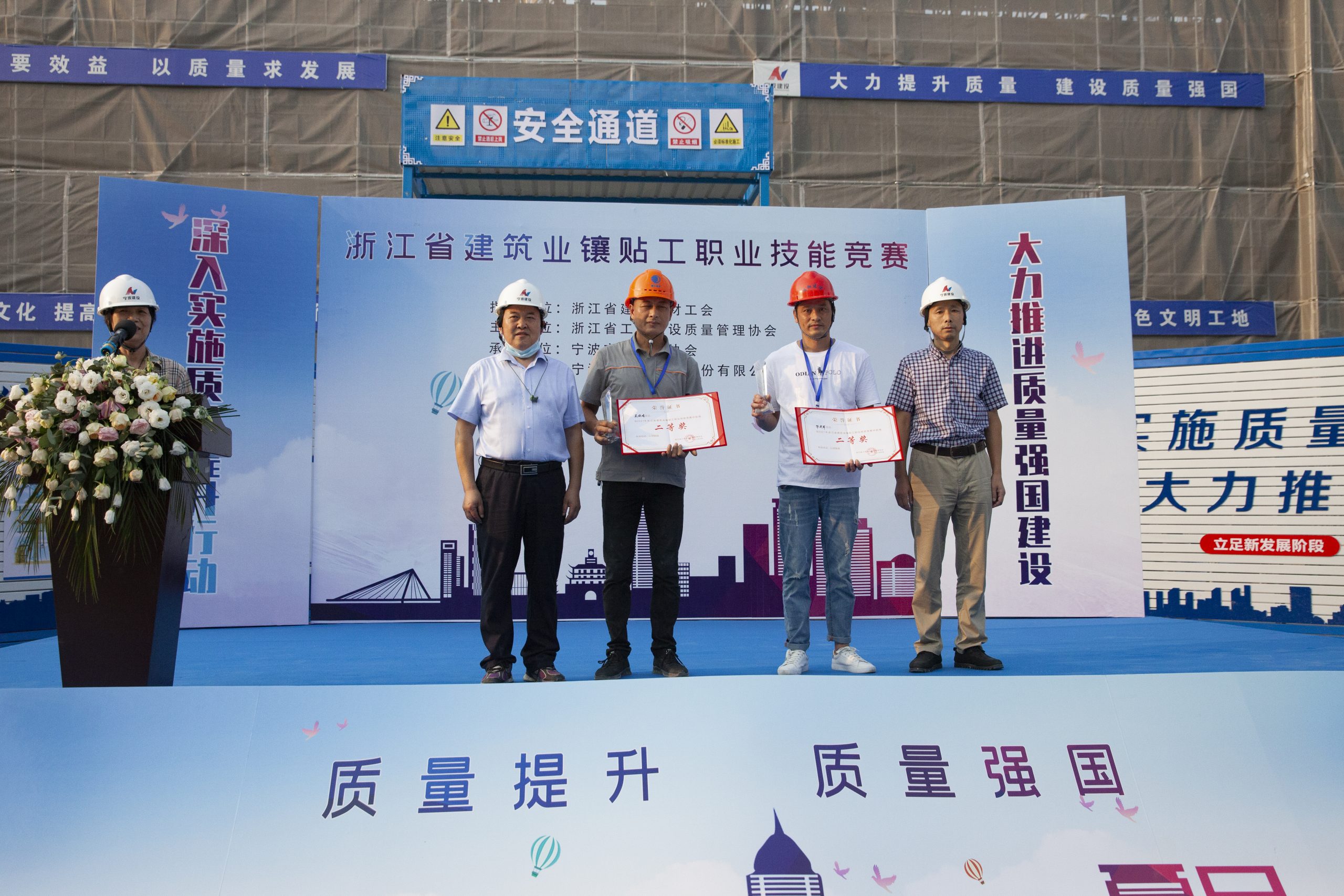 ? ? ?此外,當(dāng)天在新芝小學(xué)項(xiàng)目觀摩會現(xiàn)場,還舉行了全省建筑業(yè)鑲貼工職業(yè)技能競賽,共有11支鑲貼工競賽隊(duì)伍同臺競技,比拼瓷磚薄貼法工藝。比賽分為理論和實(shí)操兩塊,要求參賽者從施工規(guī)范、質(zhì)量要求、裝飾構(gòu)造以及對防水、防潮、防霉等處理辦法的掌握情況等方面,決出一、二、三等獎。最后通過激烈角逐,省建投代表隊(duì)獲一等獎,寧波代表隊(duì)獲得二等獎。我集團(tuán)公司董事長陳繼東為獲得一等獎的選手頒獎。