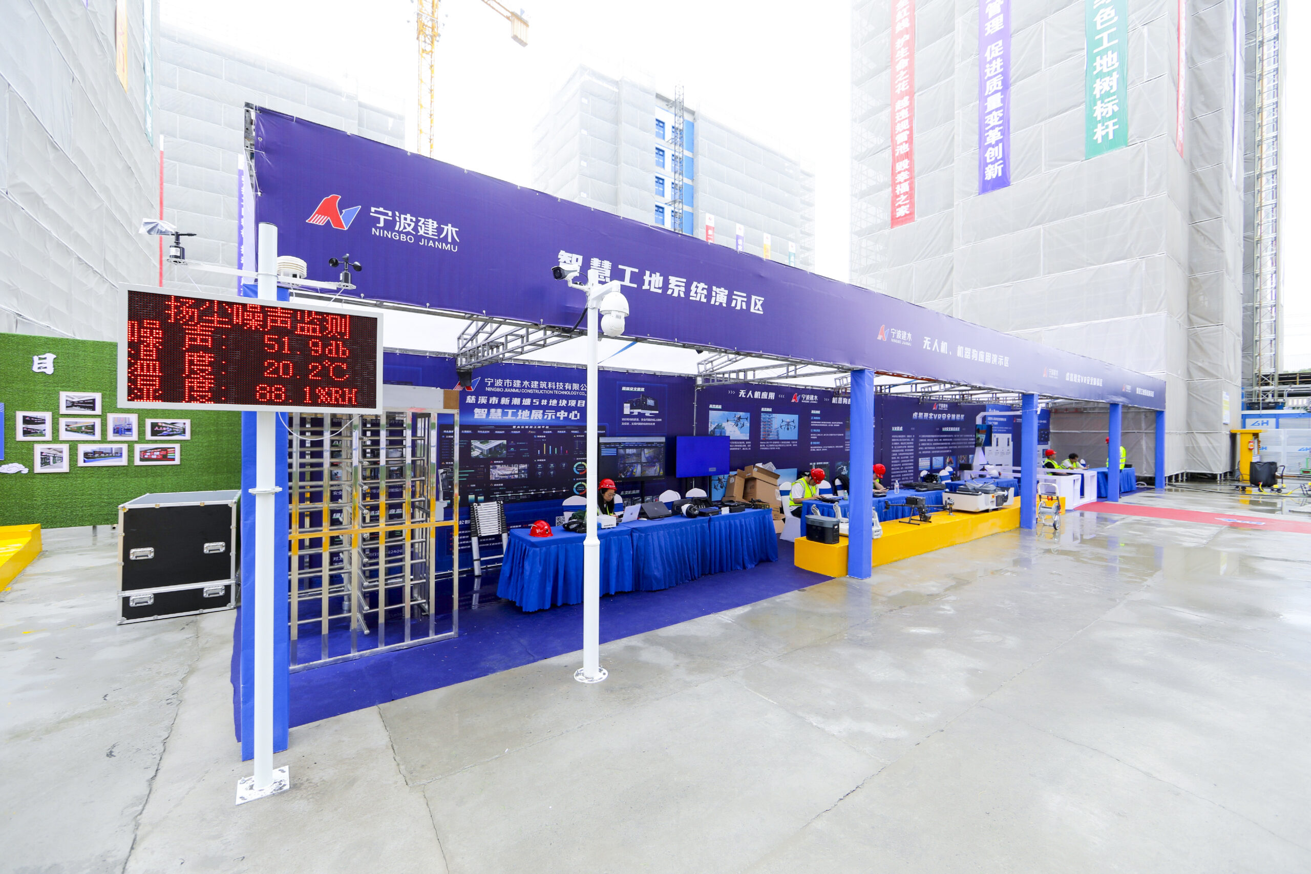 ? ? ? ?在智慧工地展示區(qū),BIM技術(shù)、VR/AR安全體驗、消防無人機(jī)、智能施工升降機(jī)及人體感應(yīng)監(jiān)測系統(tǒng)等智能化應(yīng)用成為焦點。特別是現(xiàn)場設(shè)置的安全體驗區(qū)與VR/AR體驗區(qū),通過“被動說教”到“主動體驗”的轉(zhuǎn)變,讓作業(yè)人員沉浸式感受安全防護(hù)的重要性。樓層內(nèi)懸空與攀登作業(yè)安全帶使用點采用生命線布設(shè)、工具式穿墻螺桿等多種防護(hù)形式,全面規(guī)范高處作業(yè)安全管理。